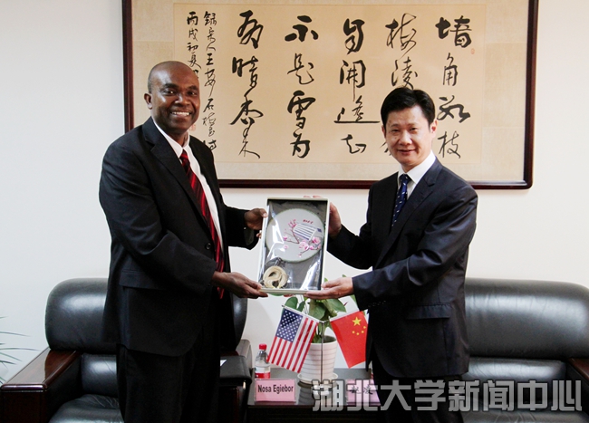 尚七网9月12日讯 9月7日,美国纽约州立大学环境科学与林业学院教务长、执行副校长Nosa Egiebor先生,副校长Christopher Nomura教授以及Shijie Liu教授一行3人来湖北大学访问,校长赵凌云、副校长蒋涛会见了来访客人。国际交流与合作处、生命科学学院、资源环境学院、化学化工学院和国际教育学院负责人参与会见。