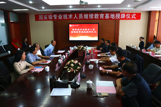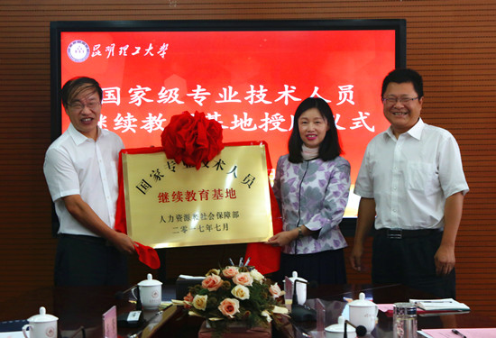 仪式上,国家人力资源和社会保障部专业技术人员管理司继续教育处负责人宣读了昆明理工大学获批“国家级专业技术人员继续教育基地”的通知,俞家栋司长为我校授牌,张英杰书记代表学校接牌。