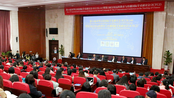 尚七网10月17日讯 10月14日上午,第十四届对外汉语国际学术研讨会(ICCSL14)暨第2届汉语远程教育与传播国际学术研讨会(ICTC2)在千佛山校区教学三楼报告厅举行。北京语言大学校长刘利教授,教育部人文社会科学重点研究基地北京语言大学对外汉语研究中心代主任王建勤教授,新西兰梅西大学人文学院院长Kerry Taylor教授,山东师范大学校长唐波教授、党委副书记张文新教授出席开幕式。北京大学陆俭明教授、北京语言大学赵金铭教授、台湾清华大学副校长信世昌教授、澳门科技大学副校长孙建荣教授等知名专家应邀出席大会。来自美国、澳大利亚、日本、韩国、新西兰、台湾、澳门等12个国家和地区,以及国内高校、科研院所相关领域专家学者近300人参加会议。开幕式由北京语言大学对外汉语研究中心郑艳群教授主持。