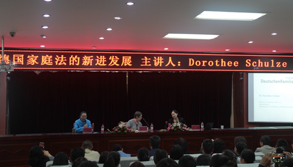多萝特•舒尔茨博士作了“德国家庭法的新近发展”的专题讲座。她从家事法、不断变革社会中的家庭生活、德国抚养法部分的最新进展、防止暴力和骚扰行为的民法保护中秉承的“谁暴力、谁出局;谁骚扰、谁受罚”的原则、私法自治与国家干预在德国家庭法方面的新进展等方面作了讲解。