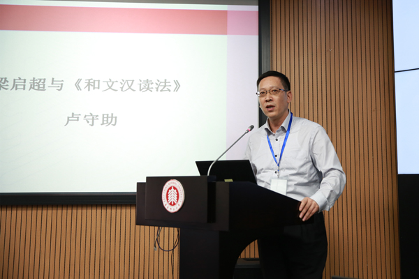 卢守助作《梁启超与<和文汉读法>》报告。他的研究发现,梁启超在戊戌变法后流亡日本,见当地西洋译书众多,走马观花,若行山阴道中,目不暇接,于是发愿著作《和字汉读法》,期望短期内令中国人掌握日语,通达海外之事。卢守助认为“该书太过盲目激进,语法体式流于粗疏,不但不能速成,还有可能带来极大的坏影响。”