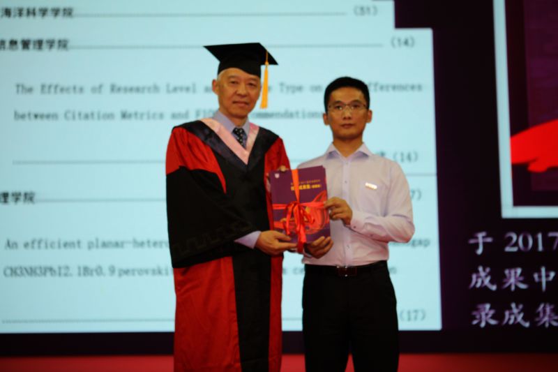 近年来,在教育部的各项政策支持下,在博士生“四三三”、硕士生“二三三”人才培养模式改革的推动下,在全校师生的共同努力下,我校研究生培养成绩斐然,在各方面取得了优异成绩,同学们在校期间取得了许多重要研究成果。《南京大学2017 届毕业研究生优秀成果集》作者代表、生命科学学院王东同学作为毕业研究生代表向学校赠送纪念品,张异宾书记代表学校接受赠品。
