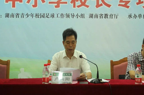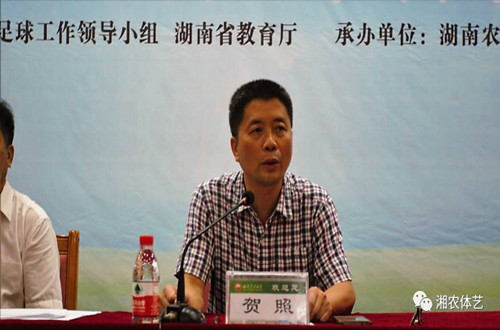 湖南省教育厅体卫艺术处处长贺照发表讲话。他首先代表教育厅向参训的中学校长表示欢迎,向承办此次活动的湖南农业大学教职工和全体工作人员表示感谢。随后介绍了全省校园足球的建设和发展情况,以及校园足球师资力量的培养。明确指出校园足球是引领体育改革的先头部队,是可以牵动全国人民的一个体育项目。他表示,要加强校园足球的育人功能,要把省中小学校园足球规划成为全国校园足球示范单位。认为特色足球学校应加强比赛竞技,为不断推动湖南省校园足球运动的发展打下坚实基础,并对培训学员提出了相关要求。