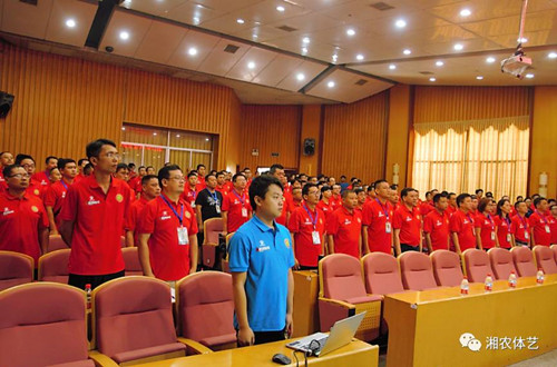 开班仪式在雄壮的国歌声中拉开帷幕。校党委副书记卢向阳致辞。他首先对参加此次培训的各位学员表示欢迎,对各级教育、体育主管部门、湖南省青少年校园足球工作领导小组对湖南农业大学的信任表示感谢。介绍了湖南农业大学的教学优势和特色、近年来所取得的优异成绩、学校对发展足球运动推行的系列举措,并表示我校将结合省校园足球发展的实际情况,全面整合利用好湖南农大的校园资源,保障和提高校园足球专项培训质量。