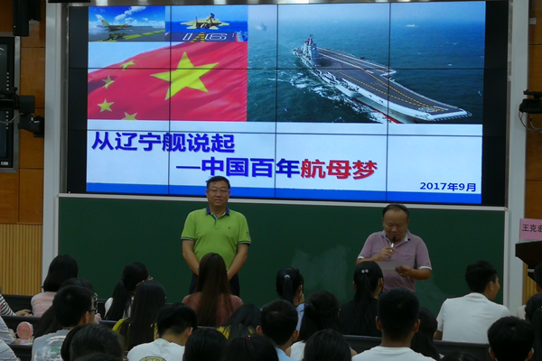 王克宏副秘书长曾任海军护卫舰舰长,多次参加南海重大演习活动和南沙备战巡逻任务,曾登上南沙、西沙多个岛礁,远航至太平洋。他以“少年强,则中国强”切入,引出中国所面临的安全感问题,阐述航母在捍卫国家主权中的重大意义,指出航母是彰显海洋强国的重要标杆,是赢得海上战争胜利的关键。王克宏副秘书长用详细的数据、丰富的照片图文并茂、深入浅出地剖析了世界航母现状、航母发展史、航母战斗群、辽宁舰重生的历程。王克宏副秘书长以大国战略视角解读了中国百年航母梦的缘起,以及艰辛而伟大的航母逐梦之旅,论述了我国发展航母的意义、定位和态度。他强调“国虽大,好战必亡;天下虽安,忘战必危”,大国之道靠实力,我们抓住战略机遇期,切实笃行,才能真正获得国家安全感。