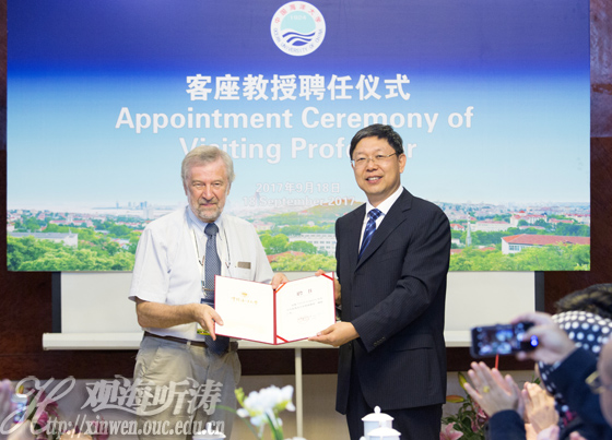 开班仪式期间,还举办了聘任比利时根特大学教授、欧洲水产创新平台国际合作部主席Patrick Sorgeloos博士为中国海洋大学客座教授的聘任仪式。