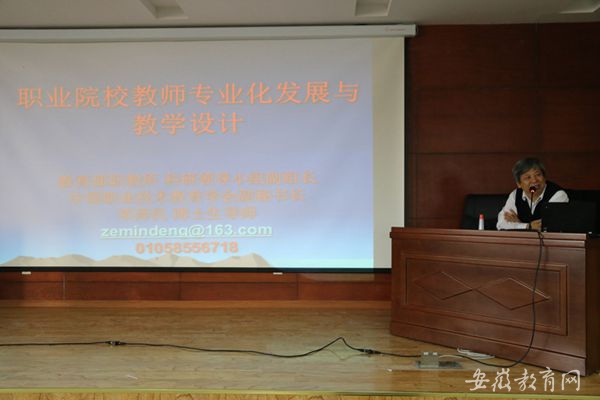 培训会上,该校校长郭颖超作了动员讲话。随后,教育部职业技术教育中心研究所教授、博士生导师,中国职业技术教育学会副会长、学术部副主任邓泽民做了《职业院校教师专业发展与教学设计》的报告。邓泽民的报告结合典型鲜活案例的分析,指出我国当前职业教育发展现状、存在的问题,职业院校的专业设置、课程构建和不同学科教学的方法与策略。同时,批判了“只教知识不教人”的传统做法,强调了以“学生”、以“效果”为导向的现代职业教育观。培训结束前,邓泽民与参训教师亲切互动交流,现场为教师答疑解惑。